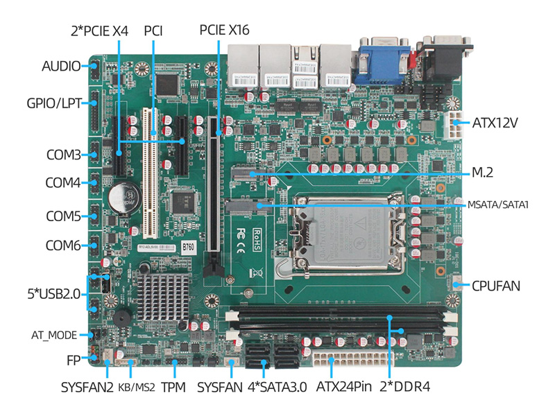 | ATX工業主板 B760芯片組,Intel Core 12-14代 LGA1700處理器 支持 5*LAN(4*i226-V+1*i219V) 支持 HDMI+DP+VGA,同/異步顯示 2*DDR4 內存槽,最大64G內存 6*USB3.0 接口,5*USB2.0 6*COM(COM1-2 支持 RS232/485) 支持網絡喚醒、上電開機、看門狗等 產品符合CE FCC ROHS規范 |