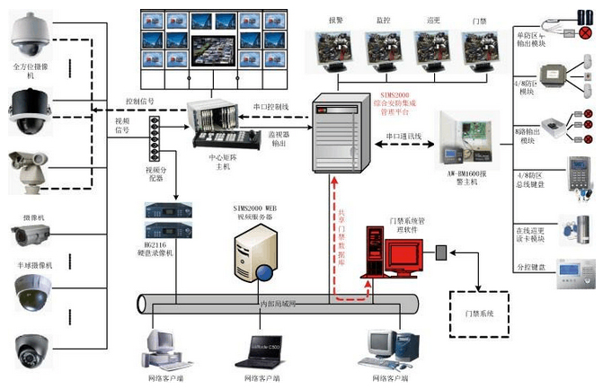 下圖所示的愛鑫微電子解決方案展示了利用綜合安防網絡集成管理軟件作為核心控制管理平臺,以低成本的方式很好的解決了上述多子系統集成遇到的種種問題。